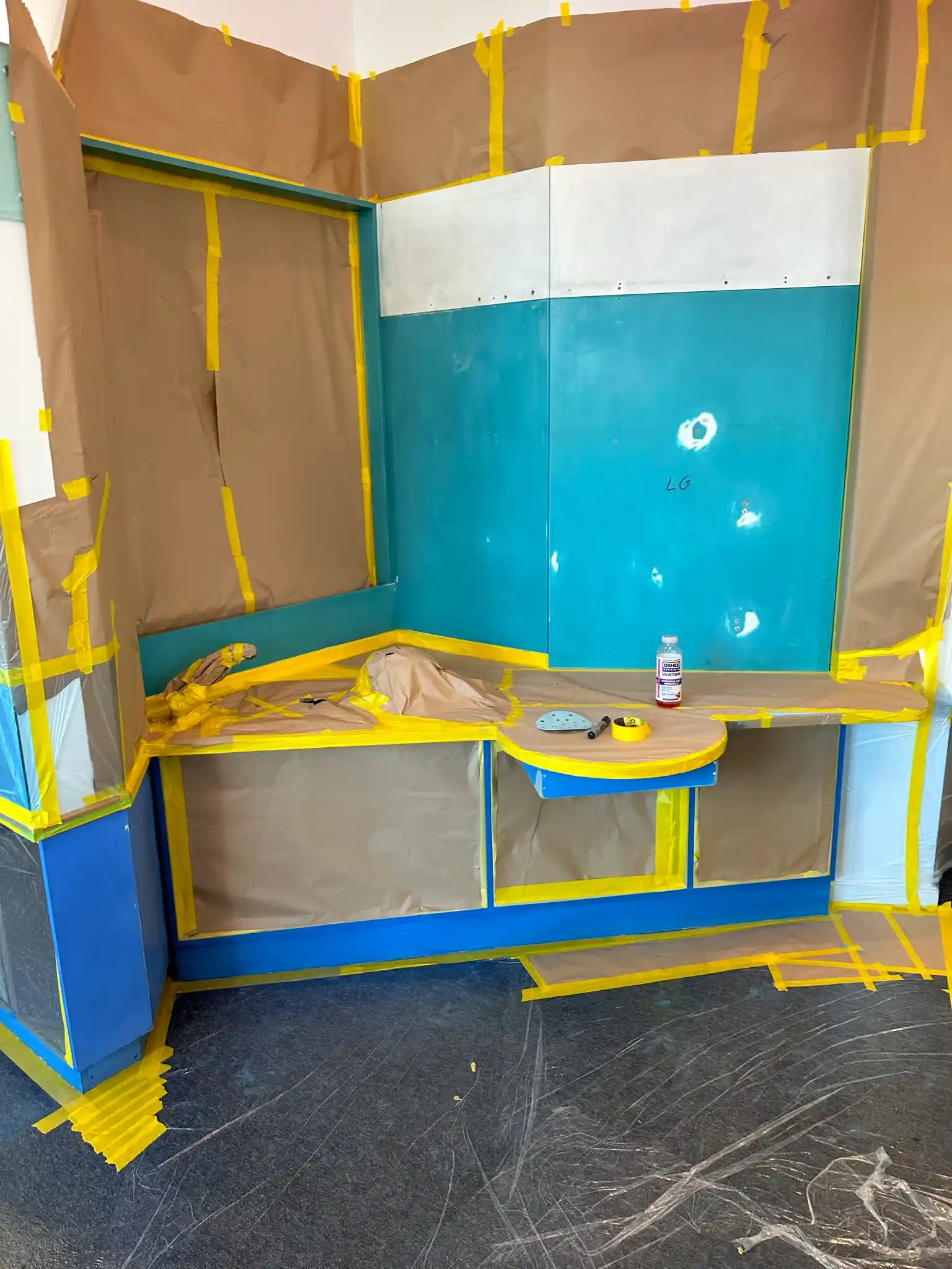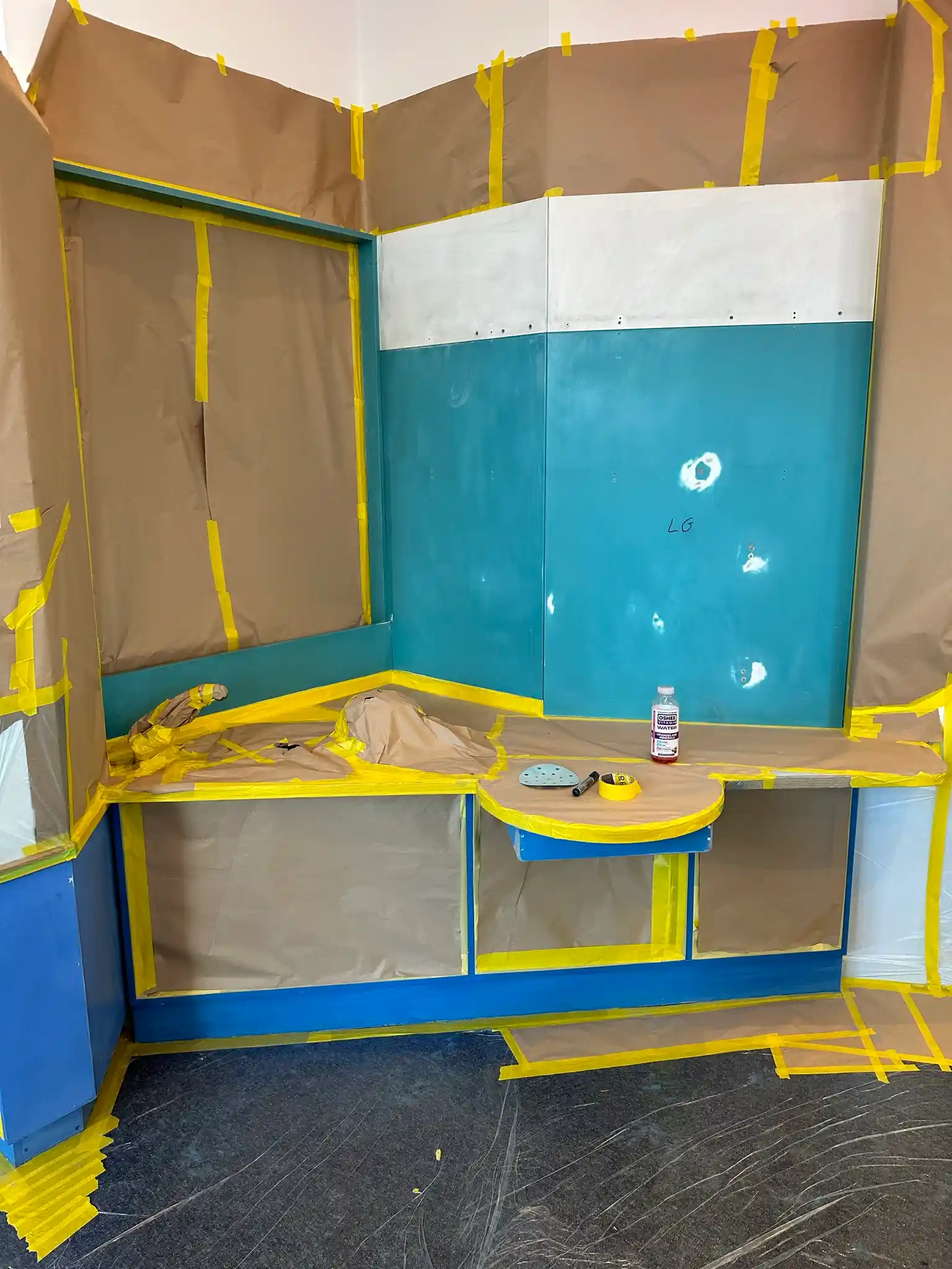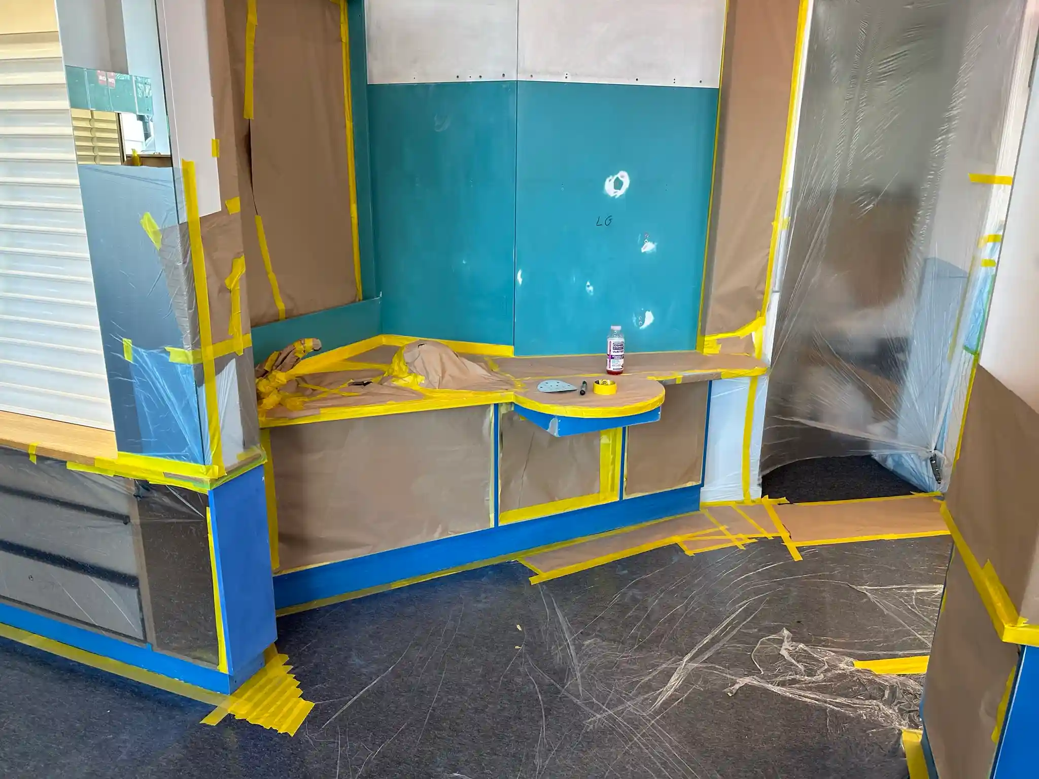 Upon arrival and starting the work, one team member was assigned to remove all 65 doors and drawer fronts, ensuring that the same person would later reinstall them.