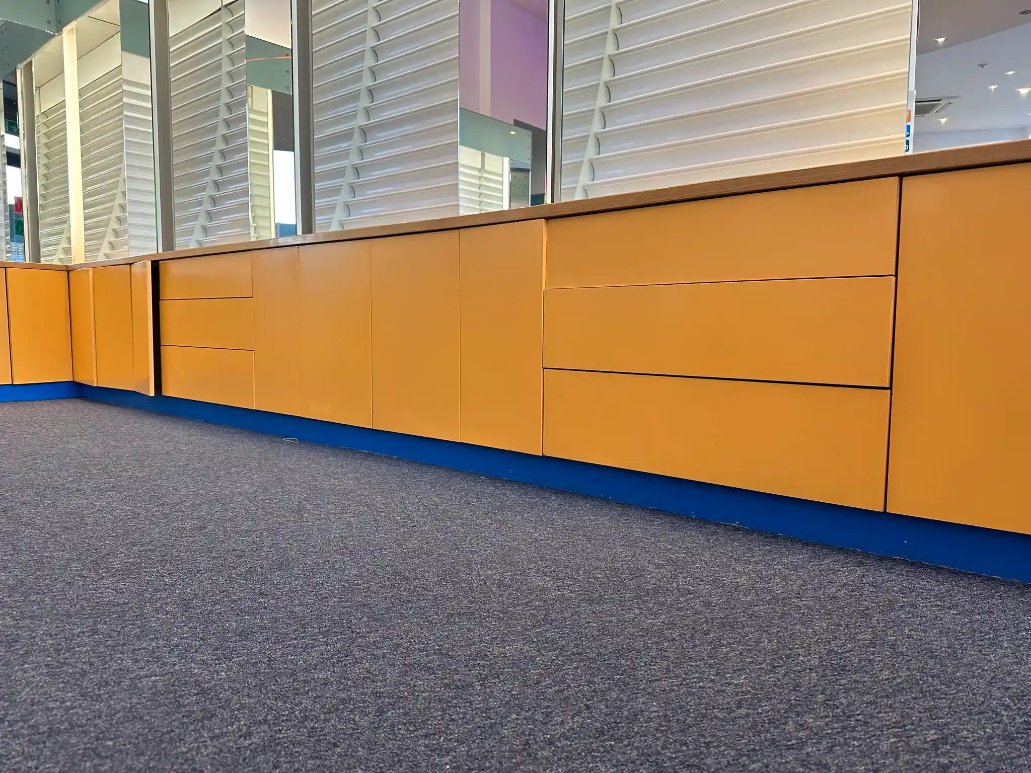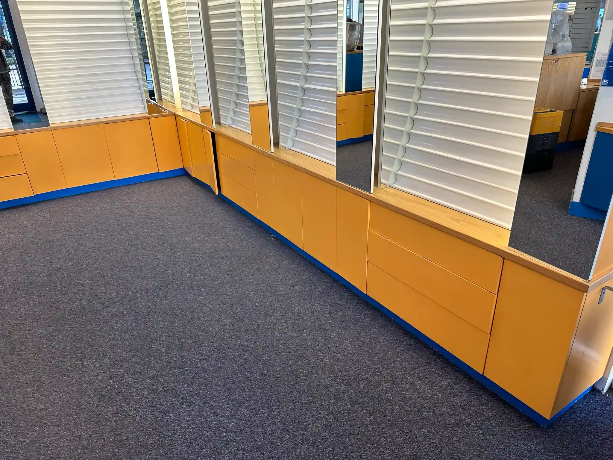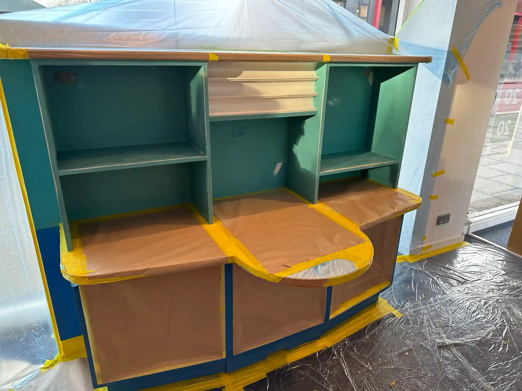 Upon arrival and starting the work, one team member was assigned to remove all 65 doors and drawer fronts, ensuring that the same person would later reinstall them.