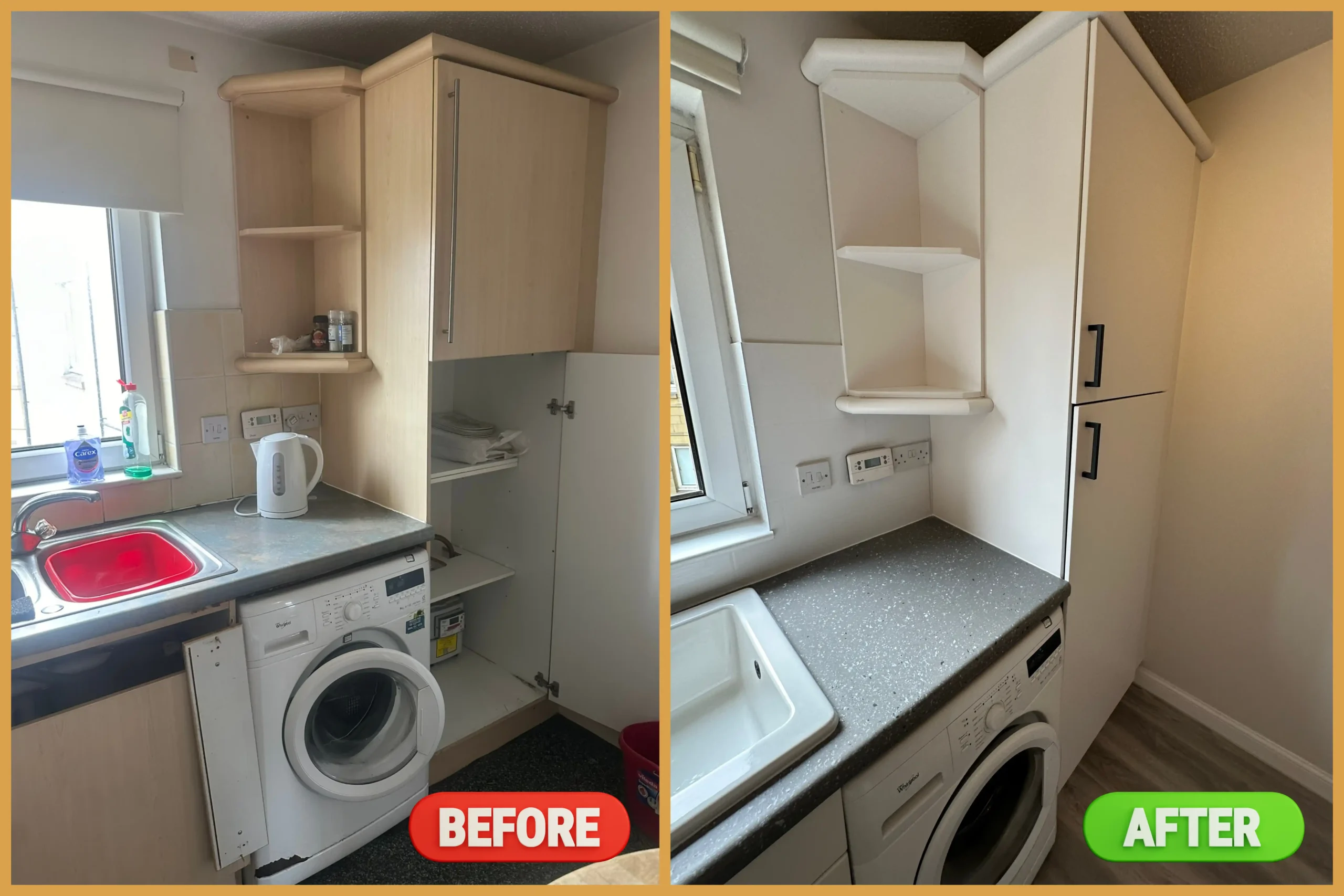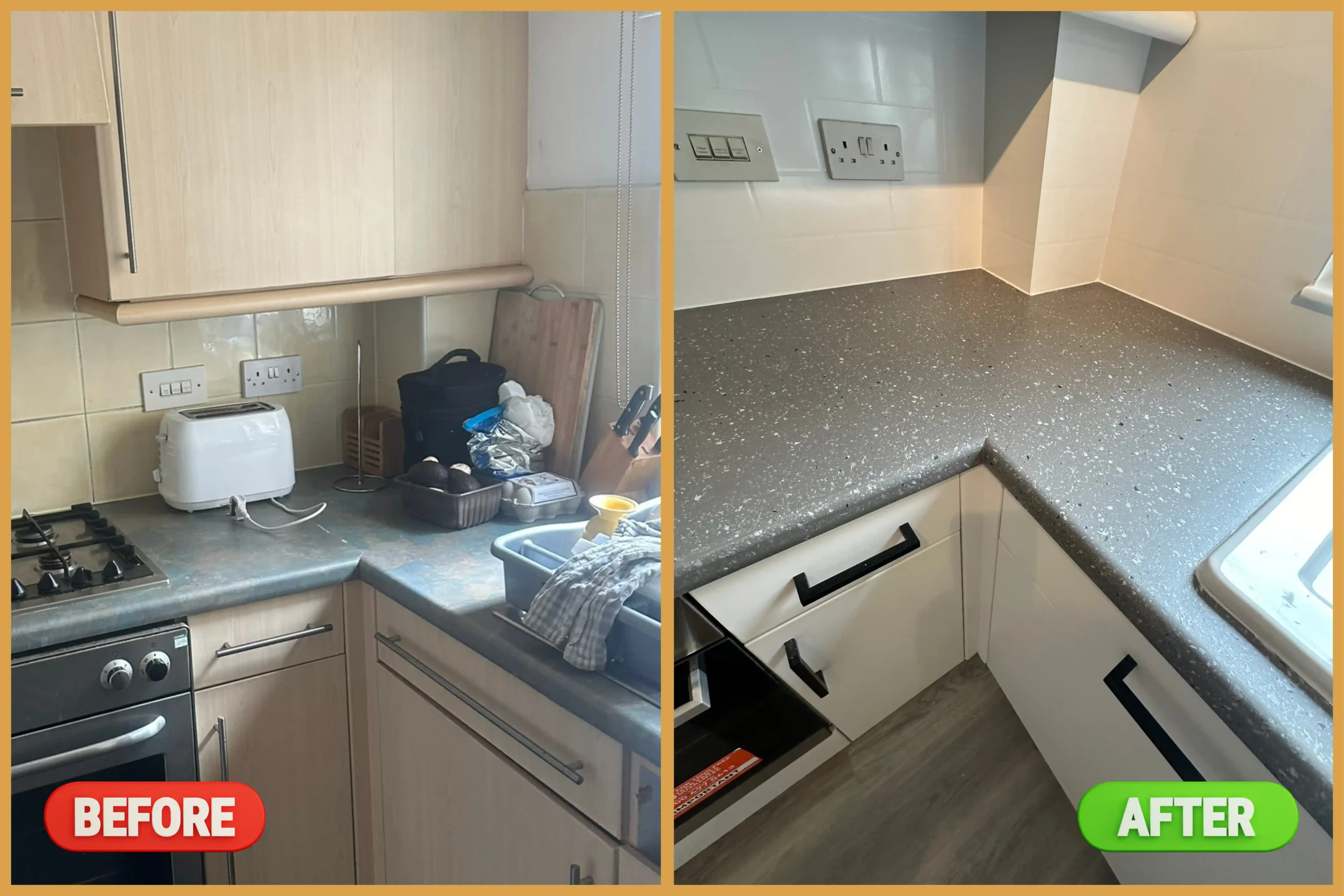 The laminate worktops were badly affected by water damage and delamination, particularly around the sink area. We removed the damaged section and replaced it, then refinished the entire surface using Mid Grey spray paint combined with Spray Granite flakes. This process created a sleek, seamless surface with an attractive stone-like effect, making the worktops look brand new without the cost of a full replacement.