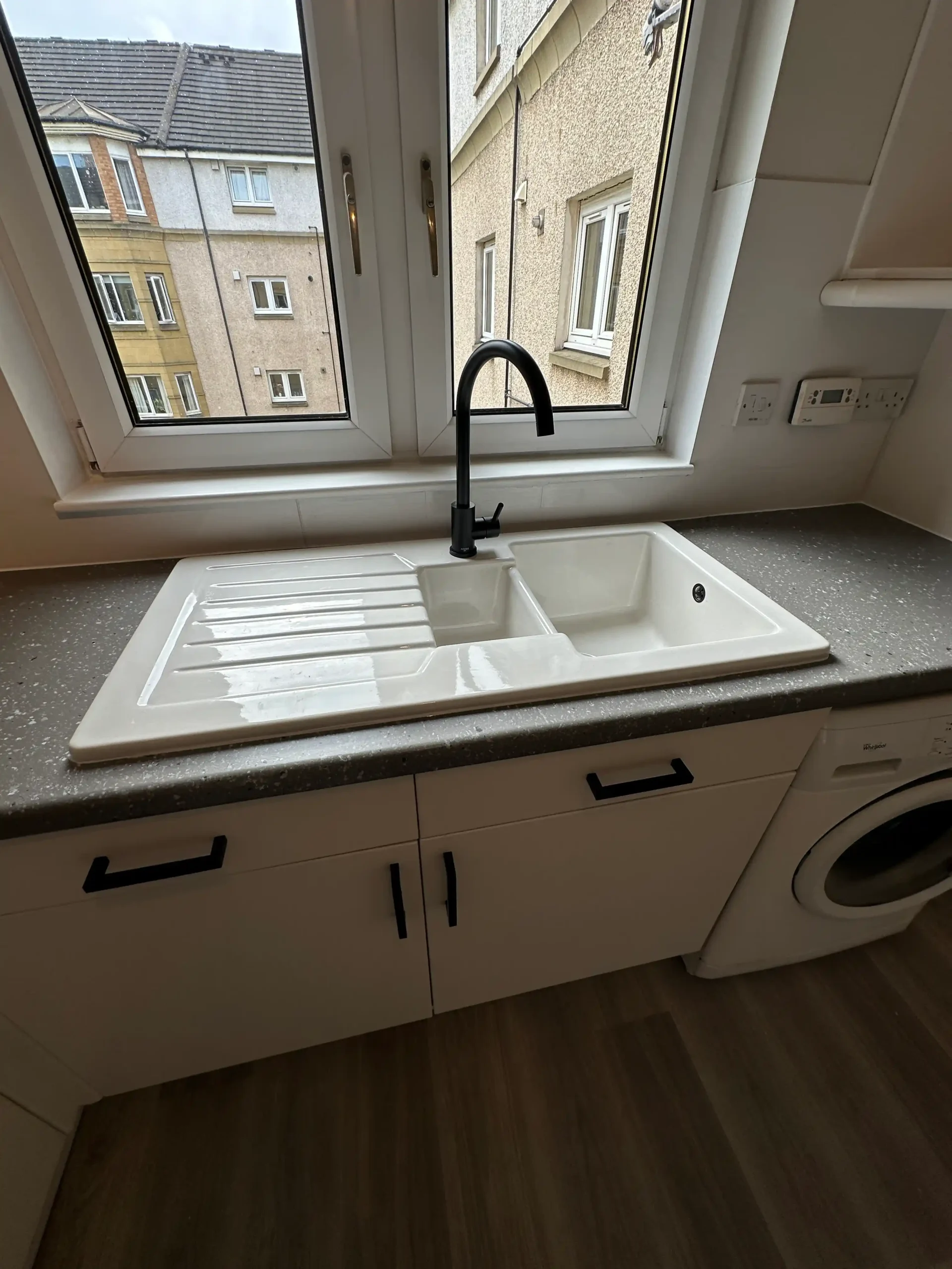 To match the refreshed kitchen, we installed Lifestyle SPC 5mm Rigid Core Vinyl Flooring in Cool Grey in both the hallway and kitchen areas. This type of LVT flooring is not only water-resistant and scratch-proof but also stylish and highly practical for high-traffic zones. Instead of using traditional quarter-round beading, we opted for a cleaner finish by sealing the edges with grey silicone, which blended perfectly with the flooring and maintained a modern, minimalist appearance.