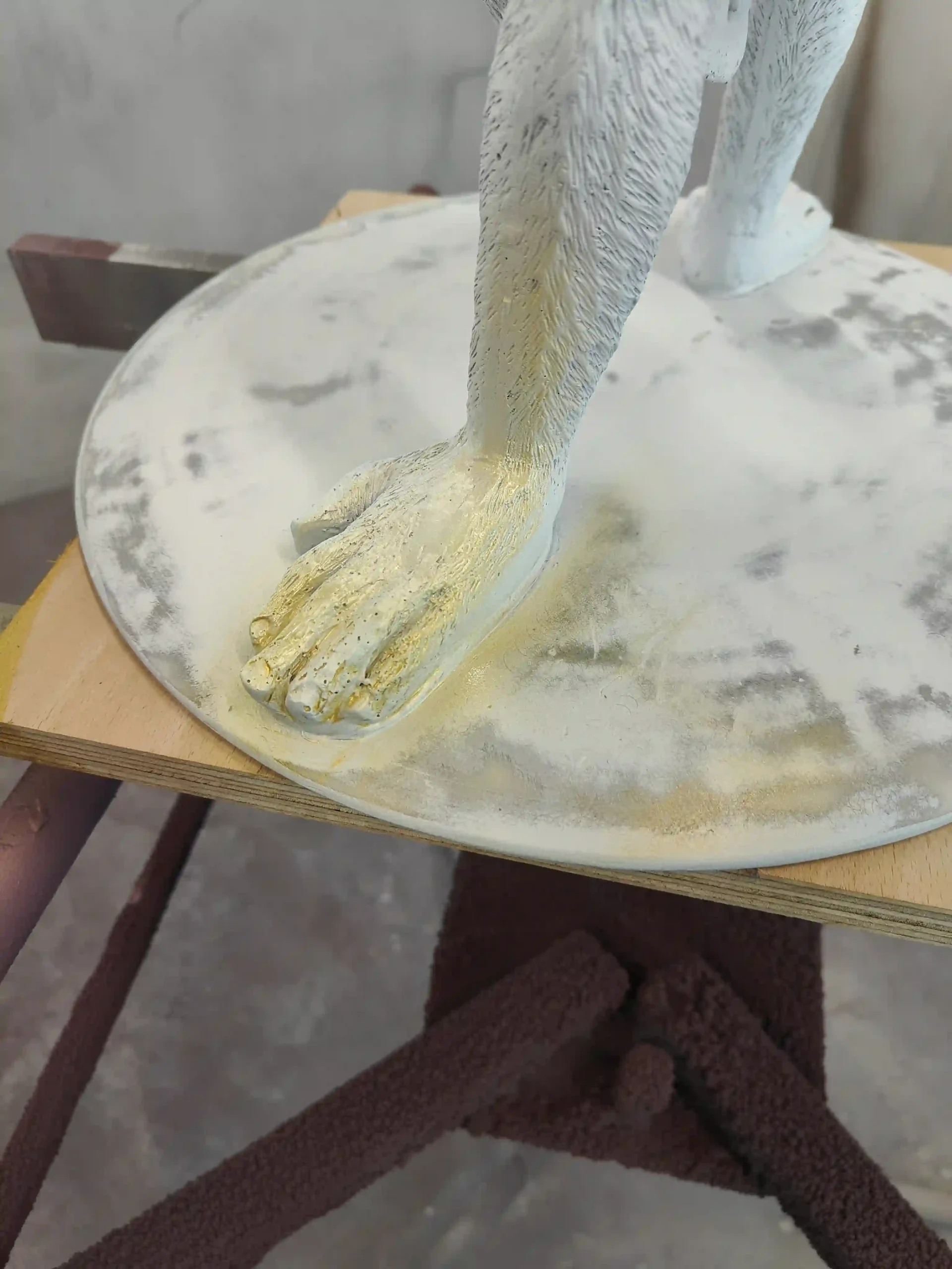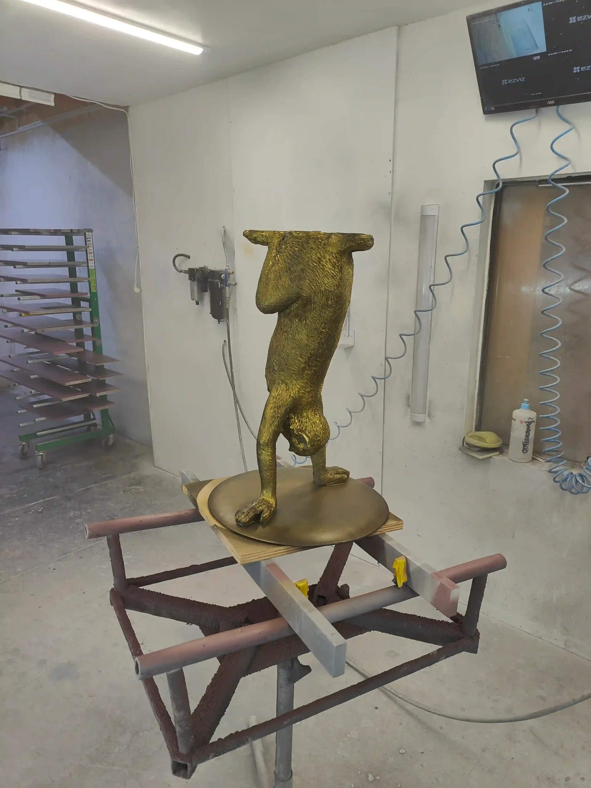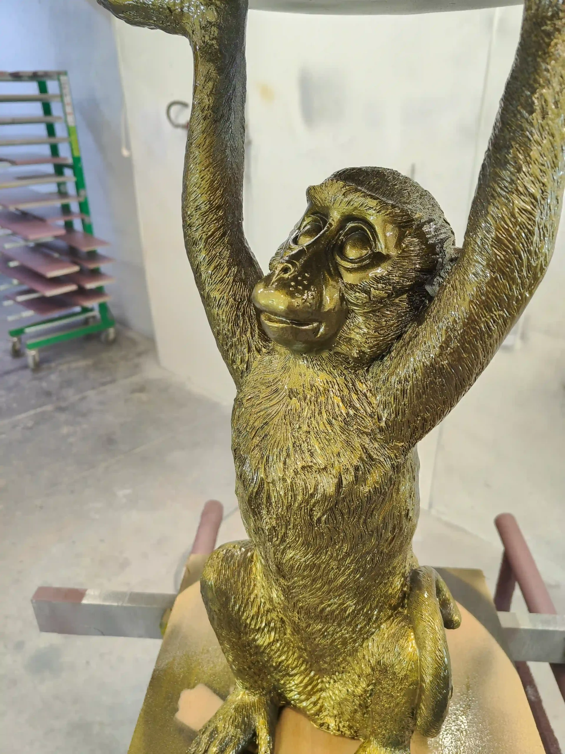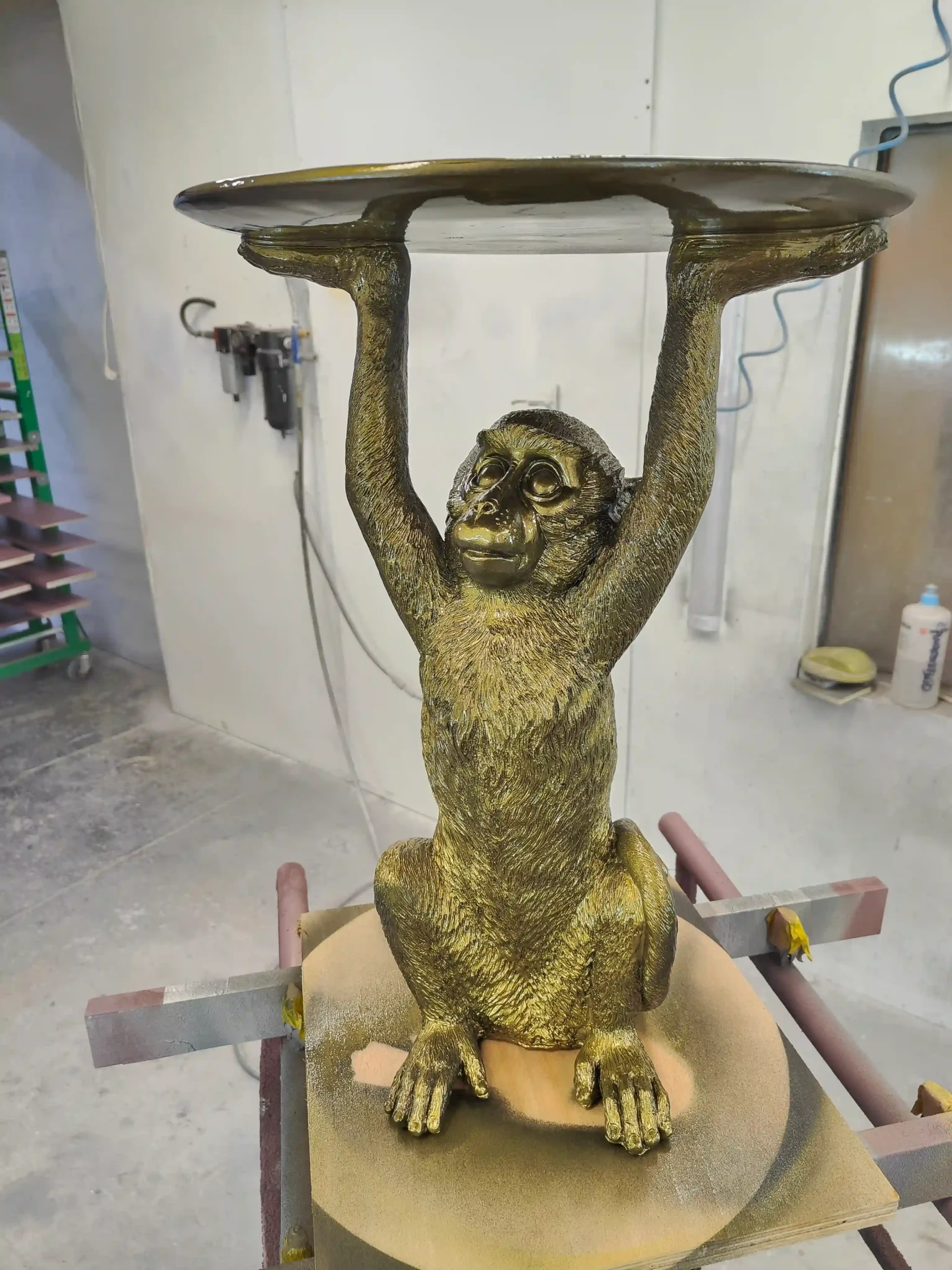 In this unique project, we transformed a decorative monkey-shaped side table using a custom metal-effect spray finish. The entire surface was thoroughly sanded to create a smooth and even base before applying any coatings. We began with a specialist adhesion primer to ensure durability on the sculpted surface, followed by a black base coat to enhance depth and contrast. Each layer was carefully sanded between coats to maintain a flawless, even texture. Finally, we applied a metallic gold effect using professional spray techniques, resulting in a rich, dimensional finish that mimics real metal. The final look is bold, elegant, and eye-catching – a true statement piece for any stylish interior.