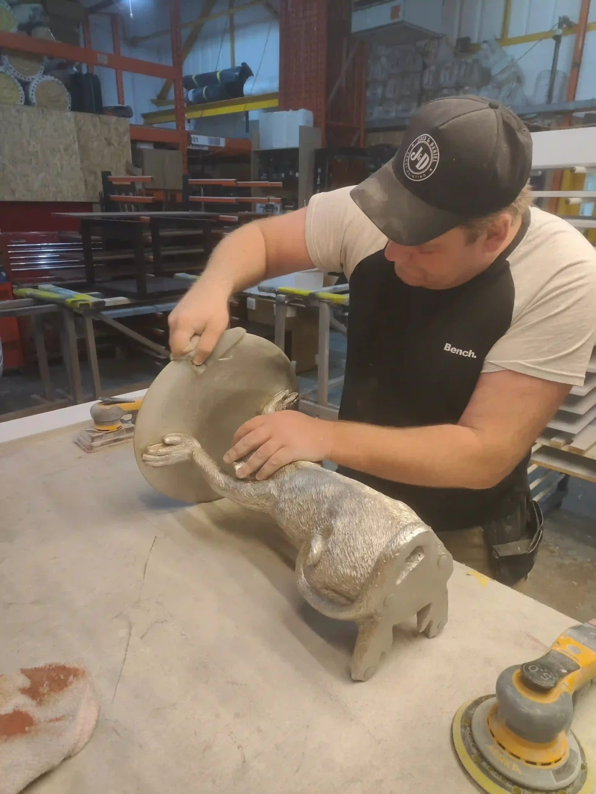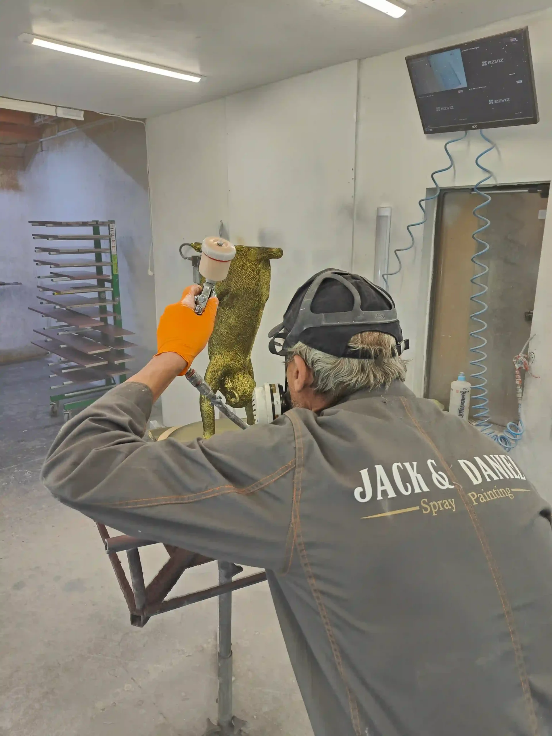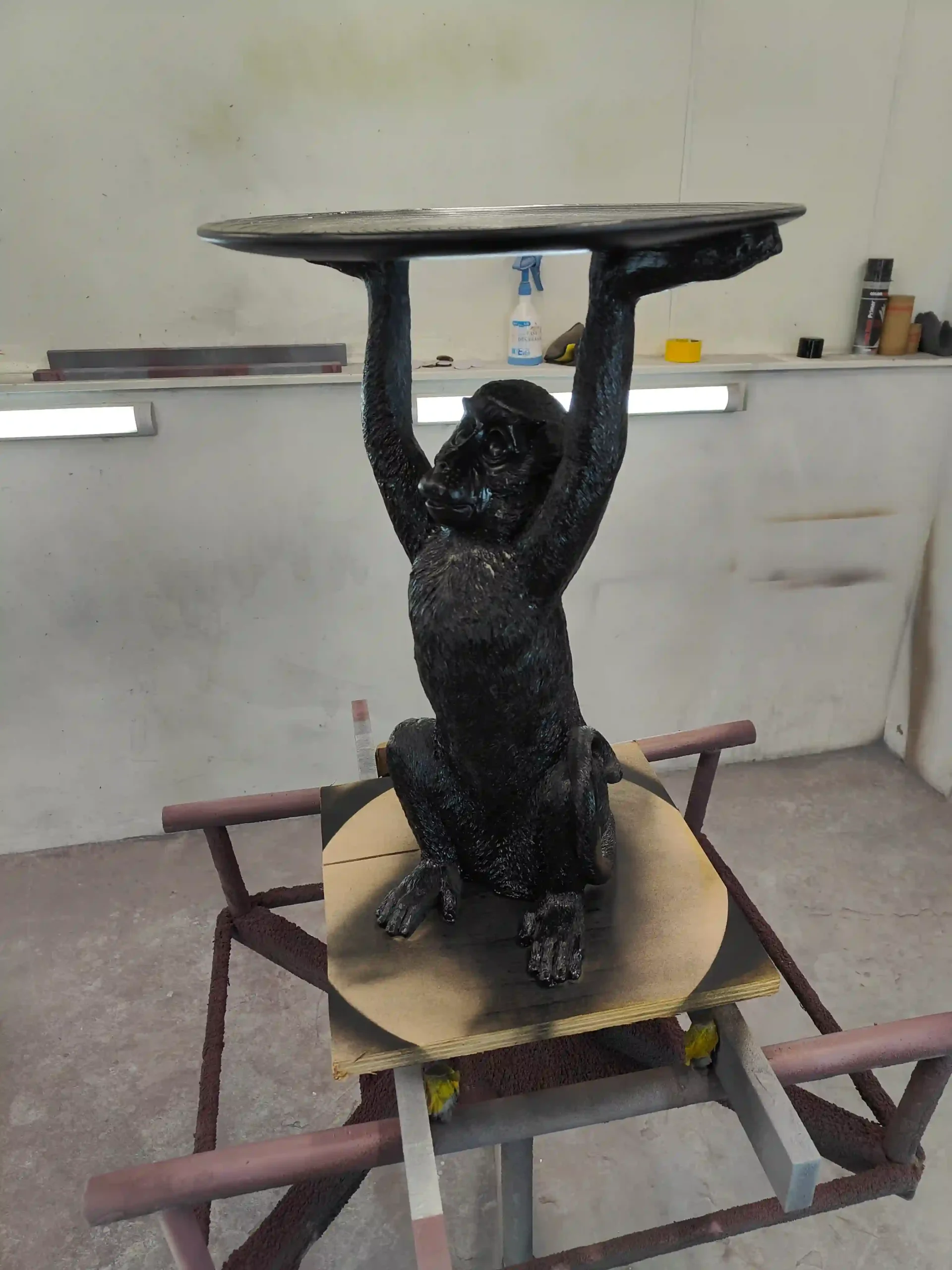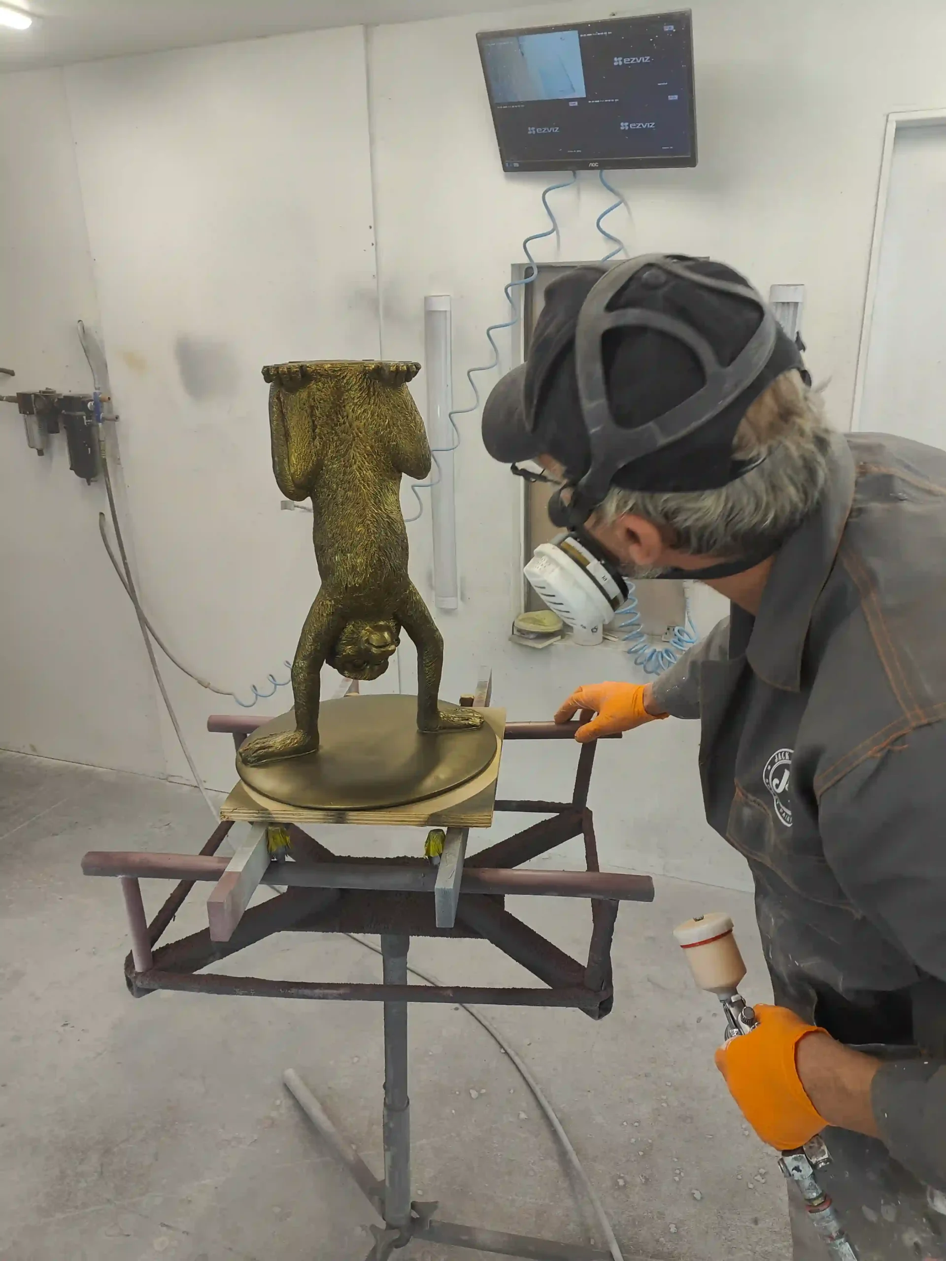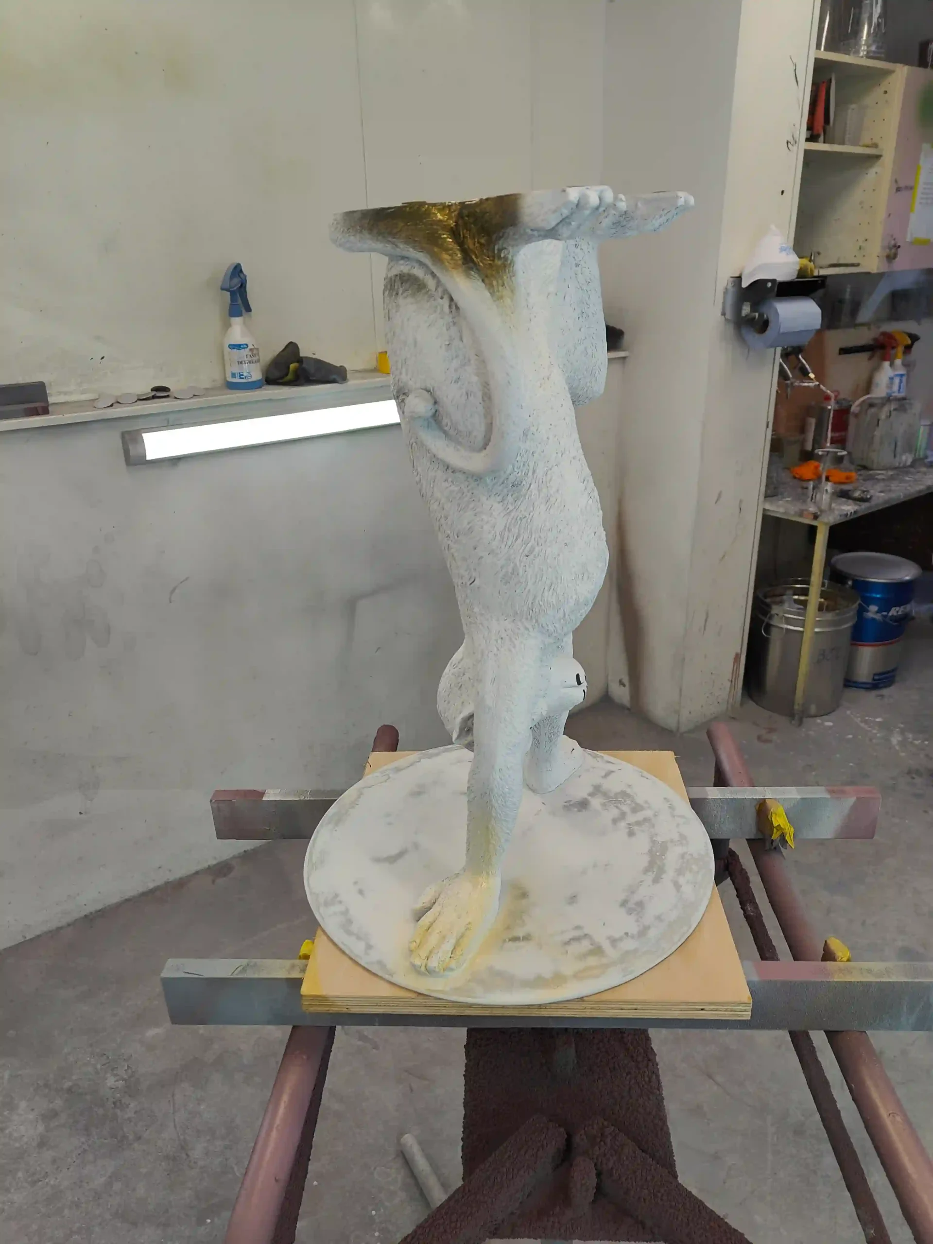 In this unique project, we transformed a decorative monkey-shaped side table using a custom metal-effect spray finish. The entire surface was thoroughly sanded to create a smooth and even base before applying any coatings. We began with a specialist adhesion primer to ensure durability on the sculpted surface, followed by a black base coat to enhance depth and contrast. Each layer was carefully sanded between coats to maintain a flawless, even texture. Finally, we applied a metallic gold effect using professional spray techniques, resulting in a rich, dimensional finish that mimics real metal. The final look is bold, elegant, and eye-catching – a true statement piece for any stylish interior.